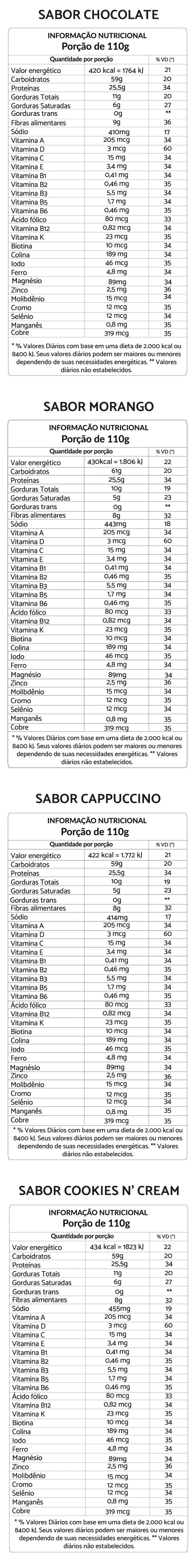 Indicamos acrescentar 400ml de água gelada e cada garrafa tem uma média de 425 kcal. Nossa tabela nutricional está disponível no link: https://www.foodz.store/pages/composicao-dos-nossos-produtos