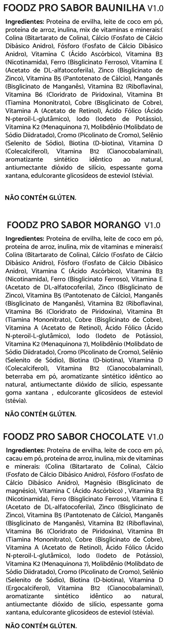 Cada refeição oferece a junção das proteínas de ervilha e arroz que entregam 40g de proteínas com perfil de aminoácidos completo, a quantidade adequada de gorduras boas vindas do leite de coco, fibras de alta qualidade que ajudam na saciedade e agora adoçado com Stévia no lugar da sucralose. Além disso, Foodz PRO é um produto low carb.